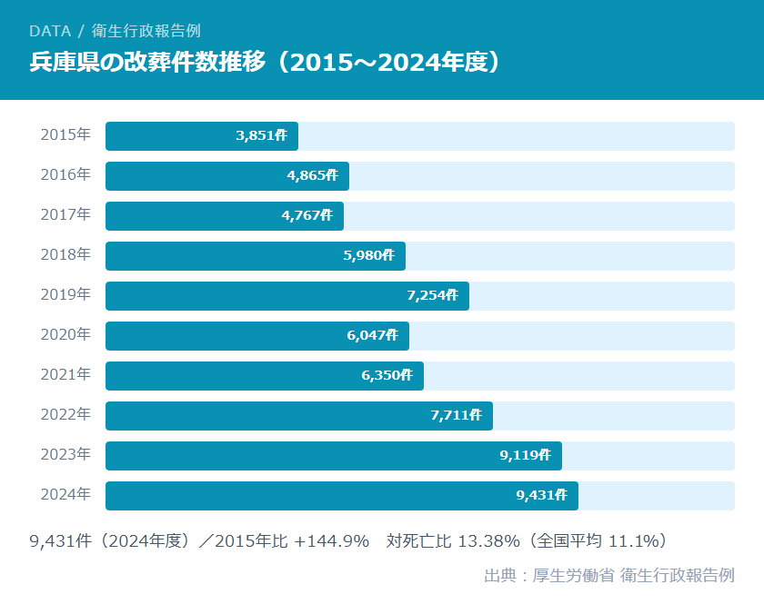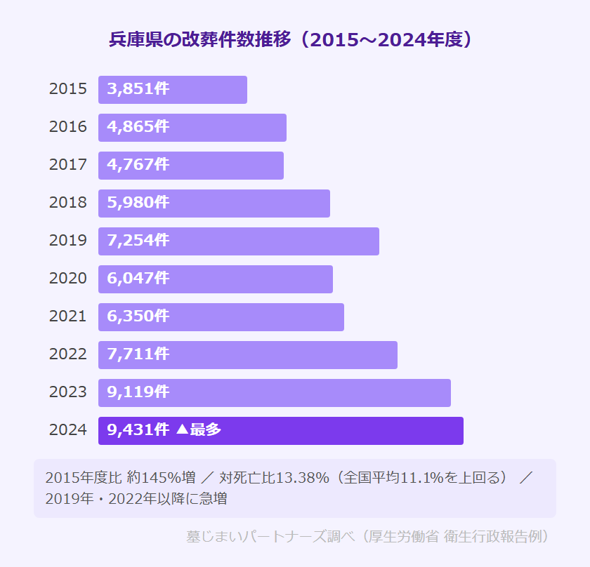 兵庫県の改葬件数は、2015年度の3,851件から2024年度の9,431件へと、この10年で約2.4倍に増加しました。対死亡比13.38%は全国平均(11.1%)を大きく上回っており、兵庫県では全国に比べて割合として多くの改葬が行われています。2019年度に7,254件と急増し、一時的に落ち着いた後、2022年度から再び急増傾向にあります。