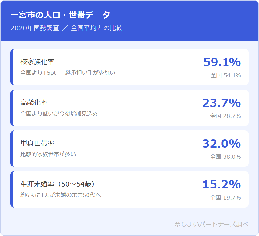 2020年の国勢調査をもとに、一宮市のお墓の承継に関わる4つの指標を確認しておきましょう。高齢化率は23.7%(全国平均28.7%)、人口増減率は+0.95%(全国平均-0.75%)と増加が続いています。単身世帯率は32.0%(全国平均38.0%)、50〜54歳時点の生涯未婚率は15.2%(全国平均19.7%)で、約6人に1人が未婚のまま50代を迎えています。