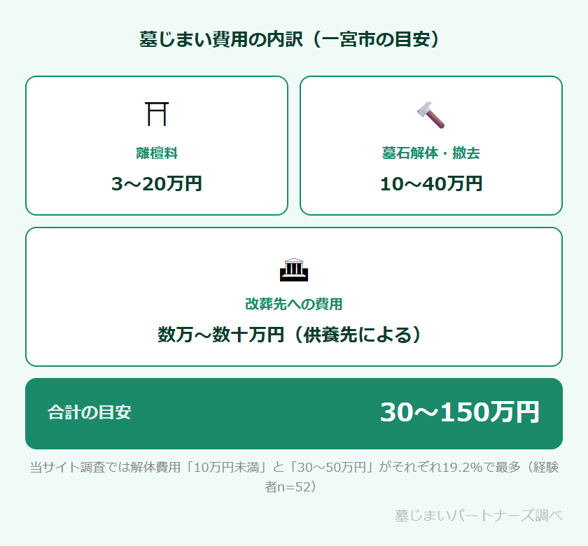 離檀料・石材店への解体費用・改葬先への費用を合わせると、30〜150万円程度になるケースが多いです。お寺のお墓か霊園かによって費用構成が異なります。複数の石材店から相見積もりを取ることで費用を抑えられる場合もあります。