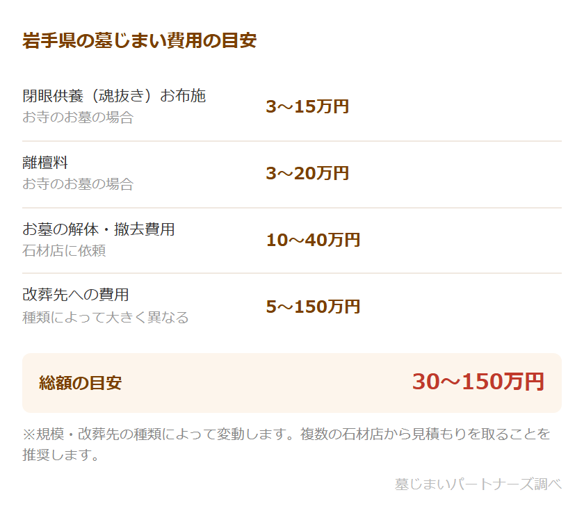 岩手県の墓じまい費用の目安