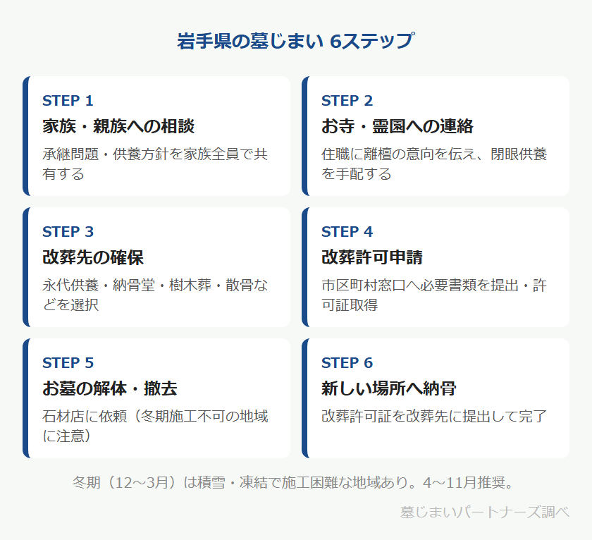 岩手県で墓じまいを進める場合、基本的な流れは全国共通の6ステップです。ただし、岩手県は面積が広く冬期の施工が難しい地域もあるため、スケジュールには余裕を持って進めることが大切です。