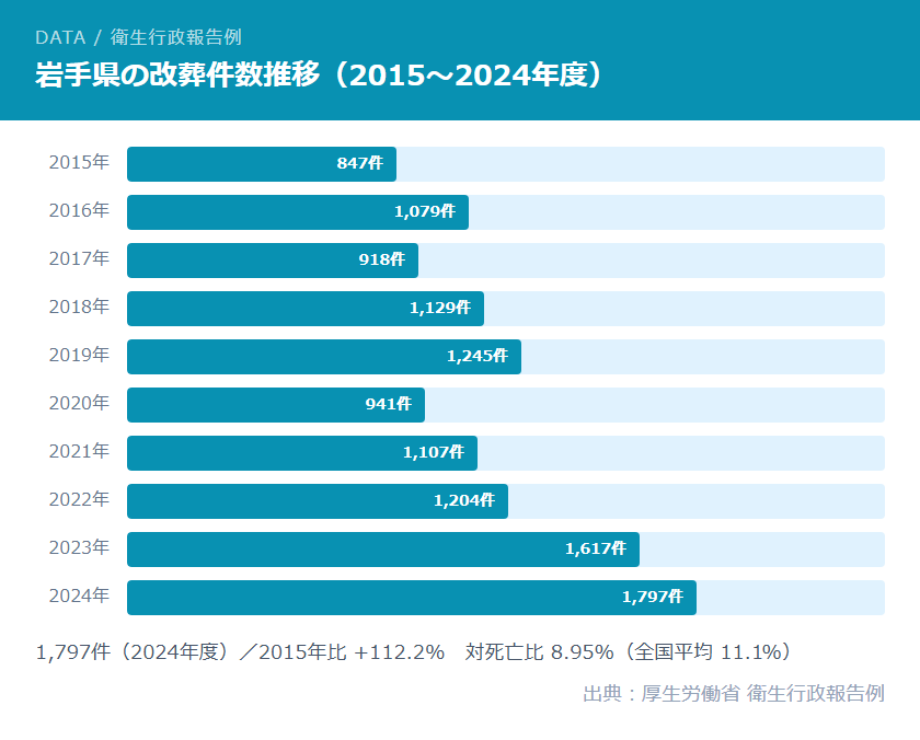 - 岩手県の改葬件数は2015年の847件から2024年の1,797件へと10年間で112.2%増加。人口流出・高齢化・承継者不在が主な背景。