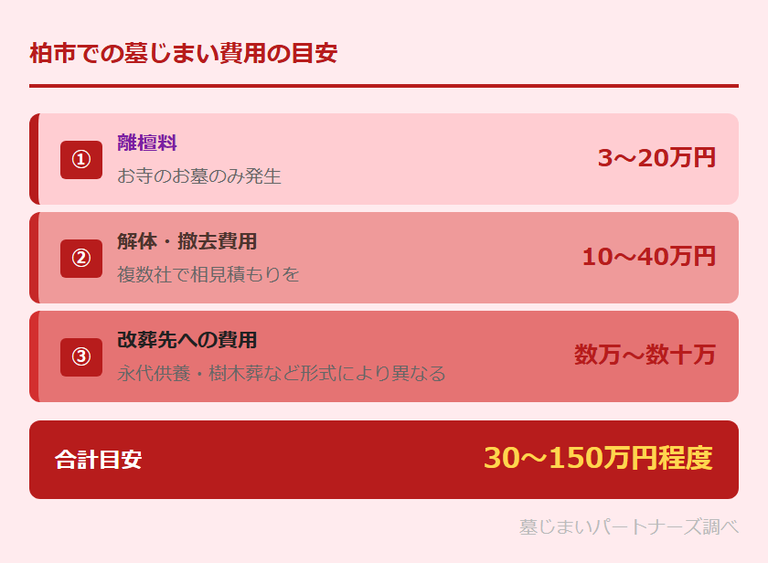 墓じまいにかかる費用は、大きく「①離檀料」「②石材店への解体・撤去費用」「③改葬先への費用」の3つに分かれます。それぞれの目安を確認しておきましょう。