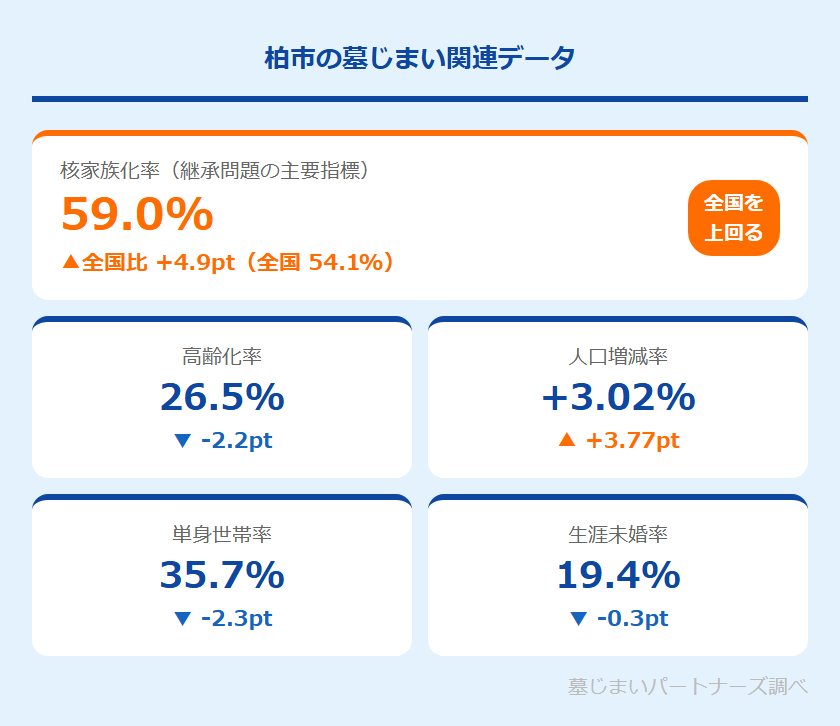 柏市の人口増減率は+3.02%と成長を続けています。しかし人口増加の多くは子育て世代や転入者によるもので、もともと地域にあるお墓の管理を引き継ぐ家族は必ずしも増えていません。高齢化率26.5%(全国平均28.7%)は全国より若めとはいえ、核家族世帯が増える中でお墓の管理者が減っていくという構造的な問題は続いています。