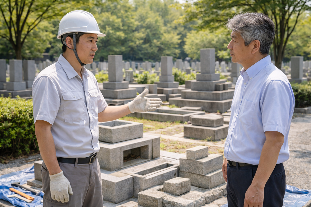 改葬許可証が交付されたら、石材店にお墓の解体・撤去を依頼します。その前に、お寺で閉眼供養(魂抜き)を行うのが一般的です。千葉県北西部エリアでは石材店の数も多いため、必ず複数社から相見積もりを取るようにしましょう。