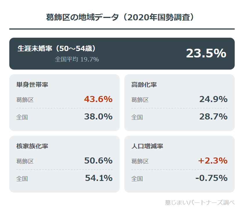 2020年の国勢調査によると、葛飾区の高齢化率は24.9%(全国平均28.7%)です。全国平均よりは低いものの、65歳以上が4人に1人に達しており、「自分が亡くなった後にお墓を管理できる人がいない」と感じている方が増えています。50〜54歳時点の生涯未婚率は23.5%(全国平均19.7%)と全国平均を3.8ポイント上回っており、承継者不在の問題は葛飾区でも現実的な課題となっています。