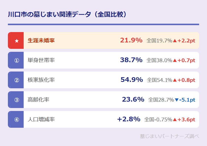 川口市は埼玉県南部に位置し、荒川を挟んで東京都(北区・足立区)に隣接する工業・住宅都市です。人口増減率+2.8%(全国平均-0.75%)と成長が続く街ですが、生涯未婚率21.9%(全国19.7%より+2.2pt)という数値が、将来のお墓の後継者問題を示しています。