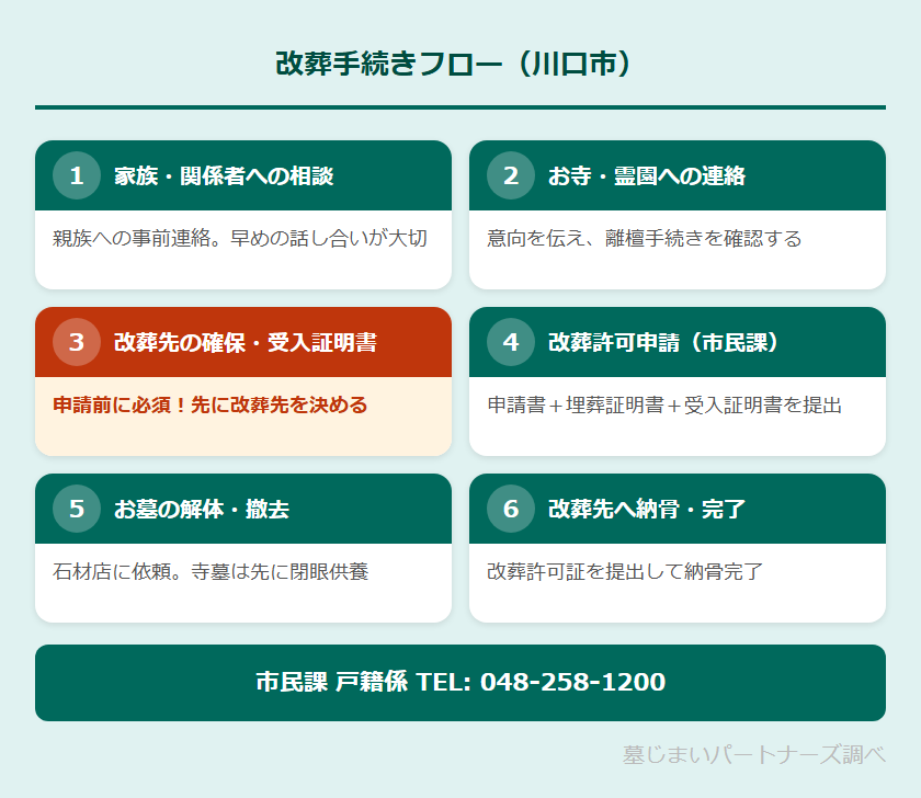 改葬先を先に決めておくことが重要です。川口市への改葬許可申請には、新しい供養先が発行する「受入証明書または使用許可書」が必要になります。供養先が決まっていない状態では申請を進めることができませんので、この順番を守ることが手続きをスムーズに進めるポイントです。