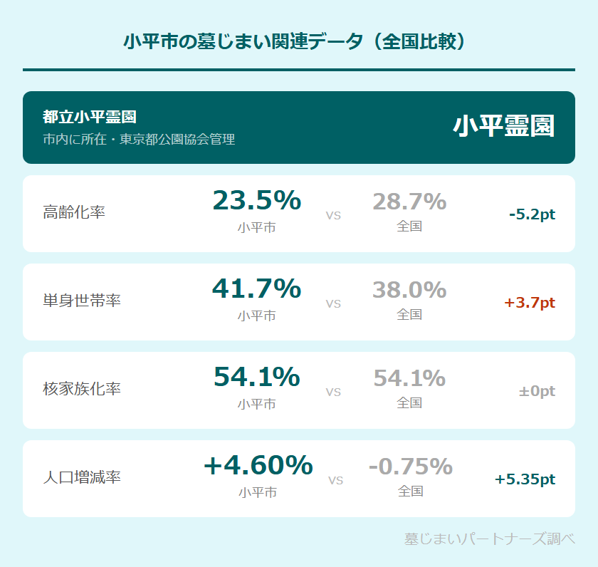 小平市は都立小平霊園を擁する地域であり、市内・近隣から多くの方が墓じまいを検討しています。人口増加+4.6%が続く一方で単身世帯率41.7%が示すように、継承者問題を抱える世帯も増えています。