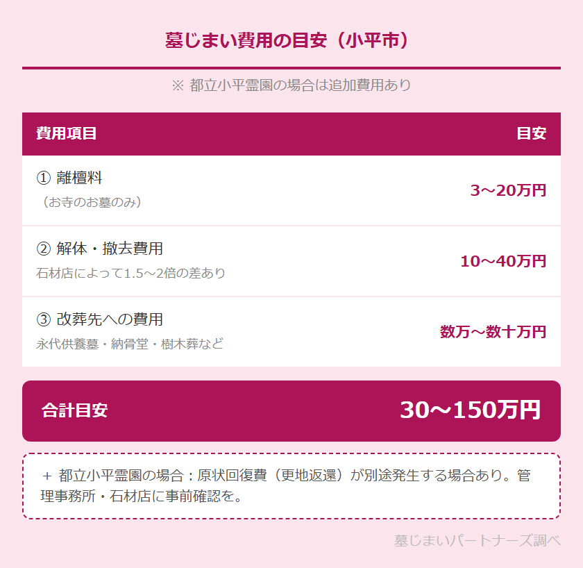 合計の目安は30〜150万円程度です(都立霊園の場合、原状回復費によってさらに加算される場合があります)。余裕を持った資金計画を立てておきましょう。