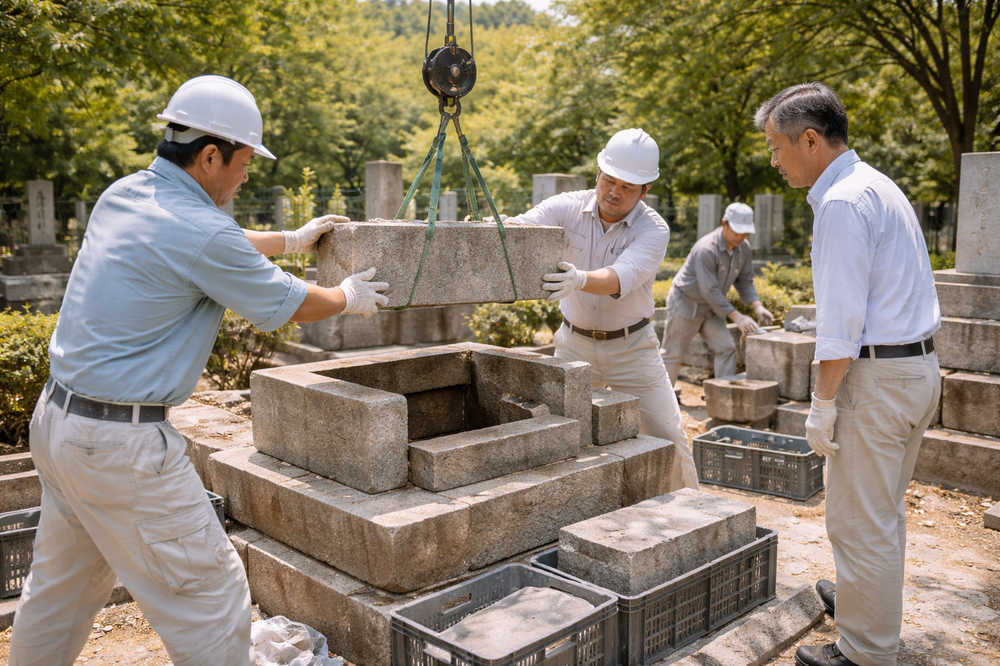 石材店に依頼してお墓を解体・撤去します。都立霊園での作業は、霊園が指定する手順や基準に従う必要があります。閉眼供養(魂抜き)を先に行うのが一般的です。