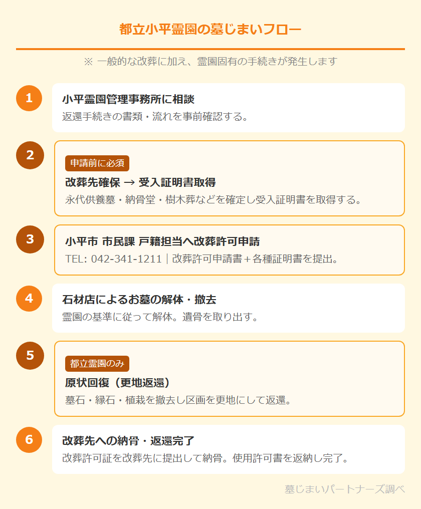 東京都公園協会 小平霊園管理事務所にご相談ください。改葬許可申請は小平市 市民課 戸籍担当で行いますが、霊園の使用許可返還・原状回復に関する手続きは管理事務所が担当します。詳細は東京都公園協会公式サイトでご確認ください。