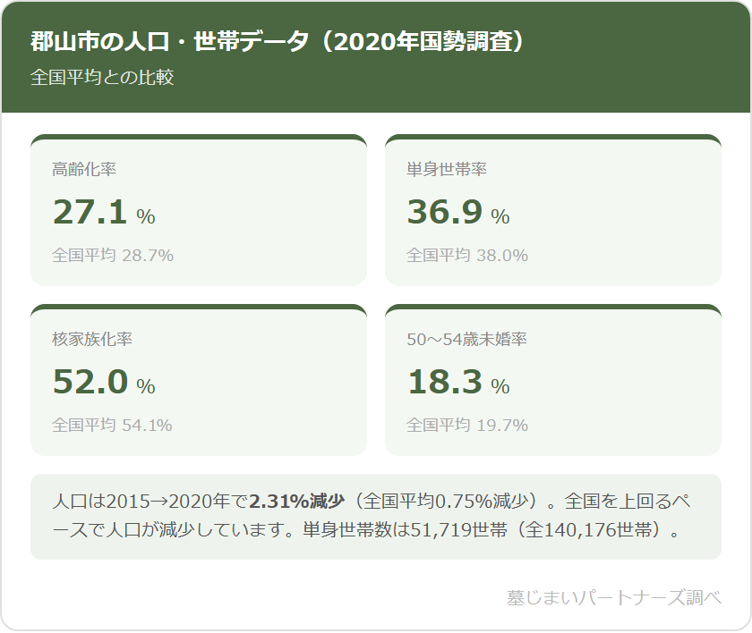 郡山市は福島県の中核都市ですが、2011年の東日本大震災以降、人口流出が続いています。2020年の国勢調査では人口増減率が-2.31%(全国平均-0.75%)と全国を大幅に上回る減少幅となっています。震災や原発事故による避難・移住で、故郷に残したままのお墓の管理が難しくなったという方も少なくありません。こうした郡山市特有の事情が、墓じまいへの関心を高めています。