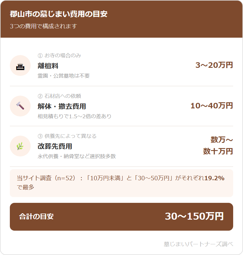 墓石を解体して区画を更地に戻す費用です。全国的な相場は10〜40万円程度ですが、当サイトの調査(墓じまい実態調査2026(墓じまいパートナーズ)、2026年3月、経験者n=52)では「10万円未満」と「30〜50万円」がそれぞれ19.2%で最多でした。石材店によって1.5〜2倍程度の価格差が生じることがあるため、必ず複数の石材店に相見積もりを取ることをおすすめします。郡山市外から手配する場合は、現地対応が可能な業者を選びましょう。