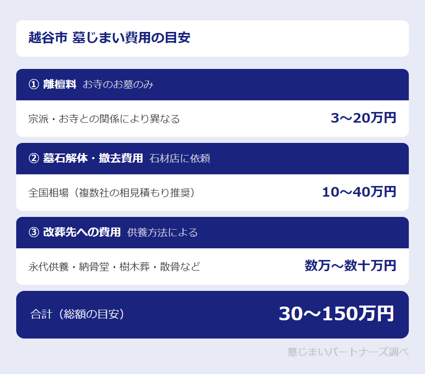 墓じまいにかかる費用は、大きく「①離檀料」「②石材店への解体・撤去費用」「③改葬先への費用」の3つに分かれます。それぞれの目安を確認しておきましょう。