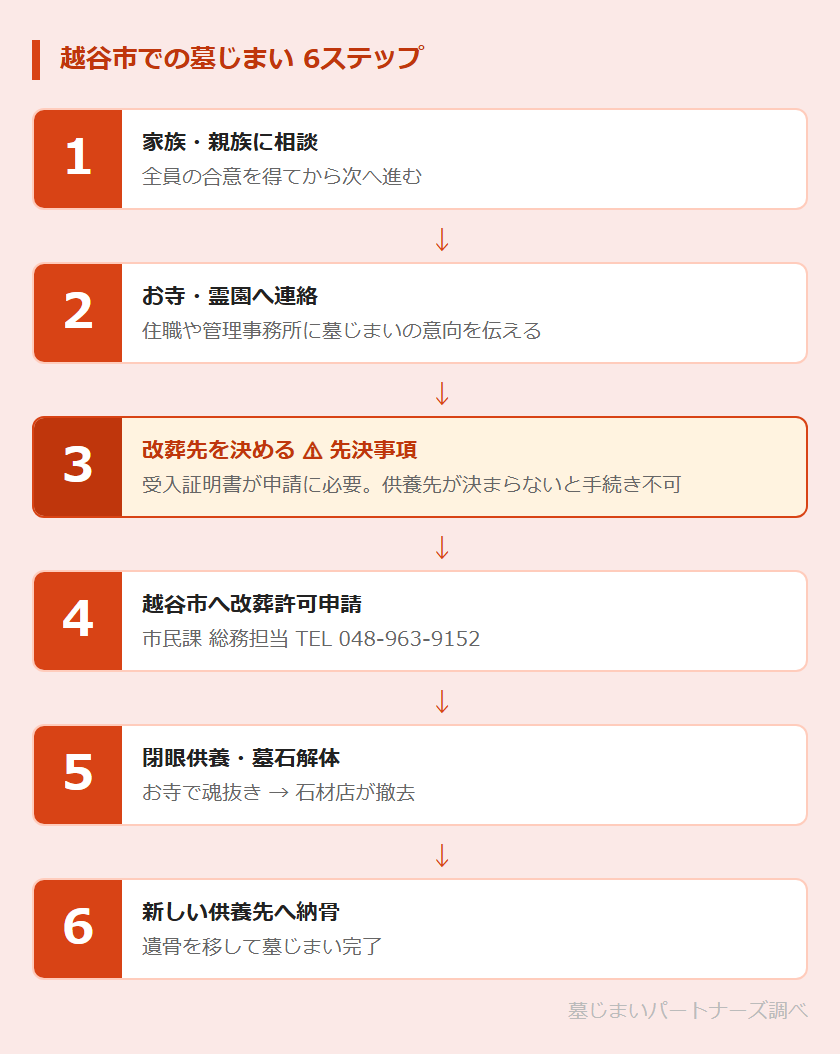 改葬先を先に決めておくことが重要です。越谷市への改葬許可申請には、新しい供養先が発行する「受入証明書または使用許可書」が必要になります。供養先が決まっていない状態では申請を進めることができませんので、この順番を守ることが手続きをスムーズに進めるポイントです。