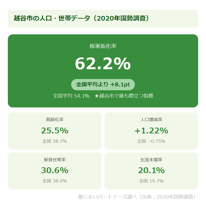 2020年の国勢調査によると、越谷市の核家族化率は62.2%(全国平均54.1%)。全国を8ポイント以上上回っており、これが越谷市で最も際立つ人口統計上の特徴です。