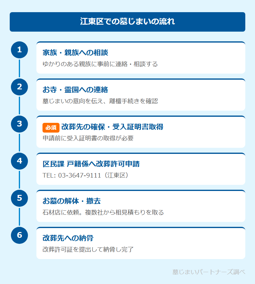 改葬先が決まったら、江東区の窓口に改葬許可申請を行います。申請窓口は区民課 戸籍係(TEL: 03-3647-9111)です。詳しくは次の章で解説します。