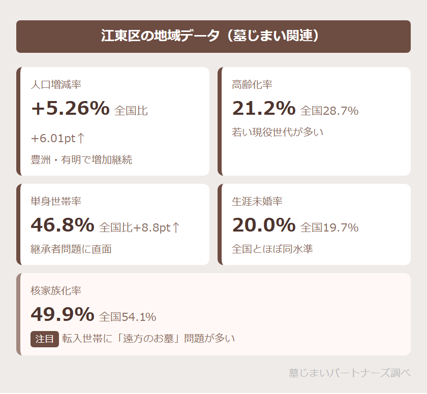 - 単身世帯率46.8%(全国38.0%より+8.8pt)・人口増減率+5.26%という江東区では、湾岸マンション転入世帯を中心に「遠方に残したお墓をどうするか」という課題を抱える方が増えています。