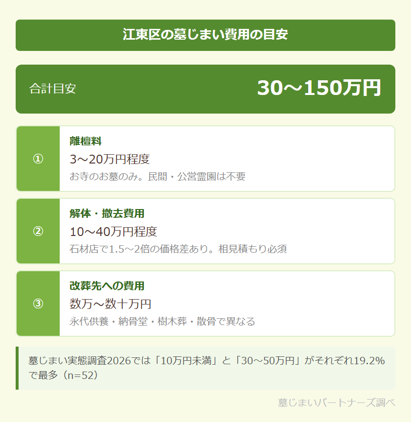墓じまいにかかる費用は、大きく「①離檀料」「②石材店への解体・撤去費用」「③改葬先への費用」の3つに分かれます。それぞれの目安と、東京都内ならではの注意点を確認しておきましょう。