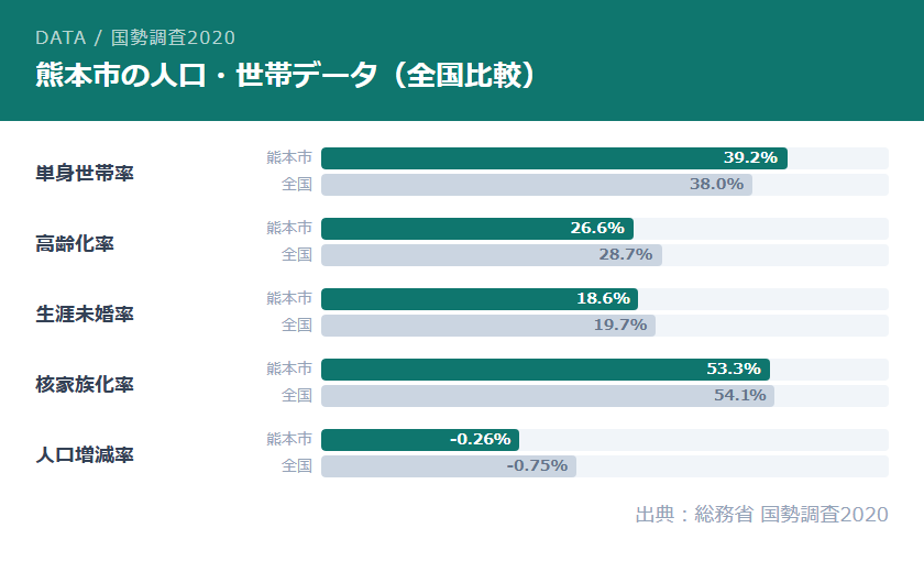 国勢調査2020によると、熊本市の単身世帯率は39.2%と全国平均38.0%を1.2ポイント上回っています。熊本市は九州第2の都市として近年人口が増加傾向にある一方、単身者・若者世帯の流入が多く、「お墓を継ぐ立場にある人」が熊本市外に出てしまっているケースが増えています。