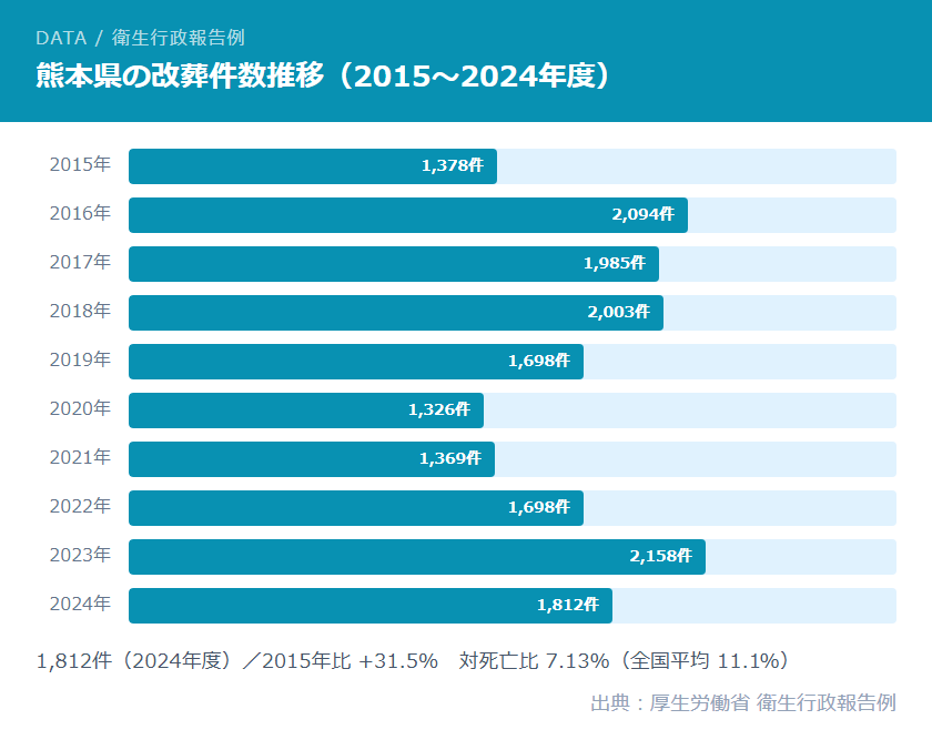 2024年度の対死亡比(改葬件数÷死亡者数)は7.13%で、全国平均11.1%を下回っています。熊本県は地域の絆や寺院との関係が根強い文化があり、他県に比べると改葬に踏み出しにくい側面があります。しかし、担い手不在・高齢化・遠距離管理という問題は年々深刻になっており、今後も増加傾向が続くと見られています。