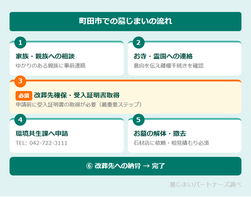 町田市の環境共生課 改葬担当(TEL: 042-722-3111)で受け付けています。申請前に改葬先の確保と受入証明書の取得が必要です。詳細は町田市公式サイトでご確認ください。