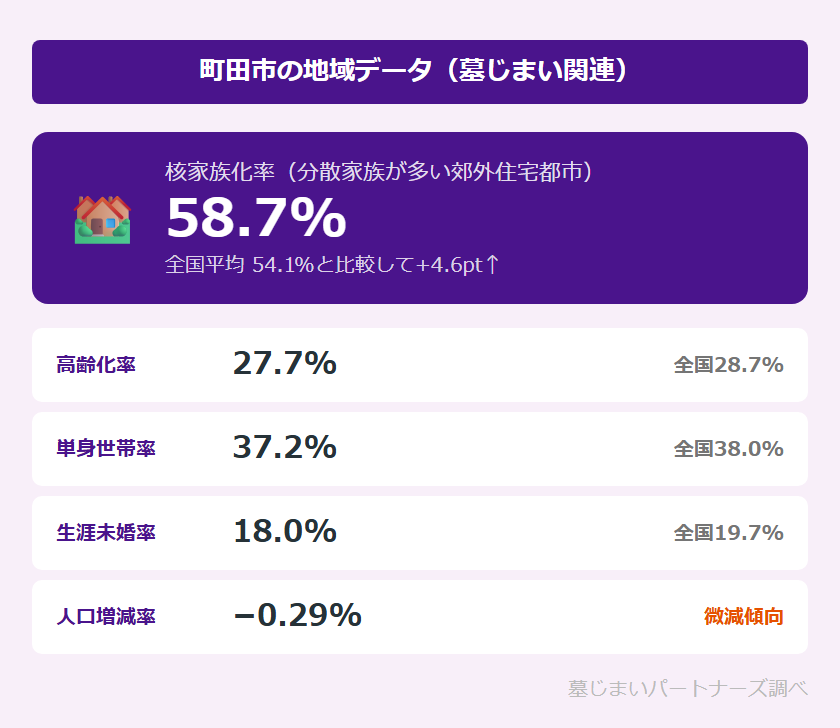 - 核家族化率58.7%(全国比+4.6pt)という町田市の実情から、子世代が遠方に住む「分散家族」のお墓問題は身近な課題です。