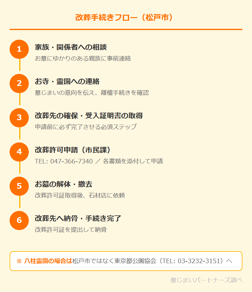 - 八柱霊園以外の改葬許可申請窓口は市民課(TEL 047-366-7340)。改葬先を先に決めてから申請を進めましょう。