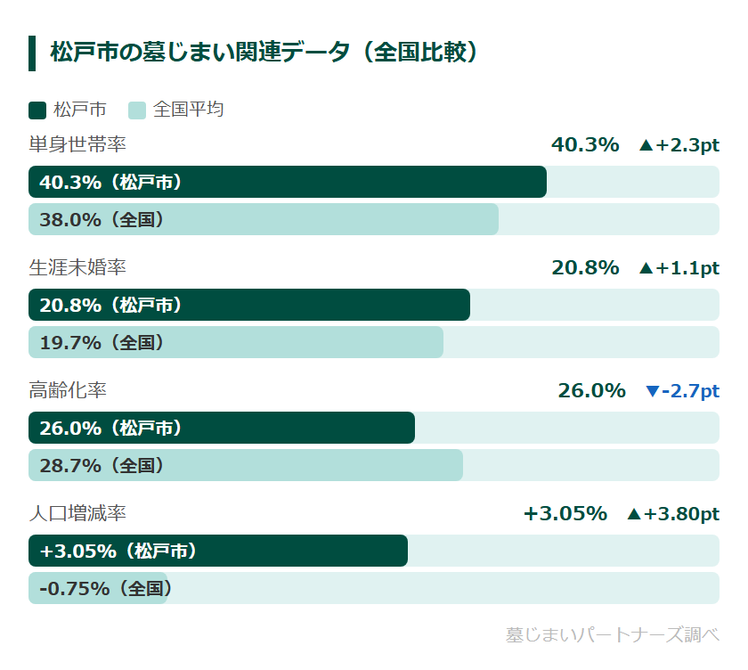 松戸市は千葉県西部に位置し、人口増減率+3.05%(全国平均-0.75%より+3.80pt)と成長を続ける東京近郊の都市です。JR常磐線などで東京都心へのアクセスが良く、全国から転入者が集まります。その一方で、単身世帯率や生涯未婚率が全国平均を上回り、お墓の承継問題が顕在化しつつあります。
