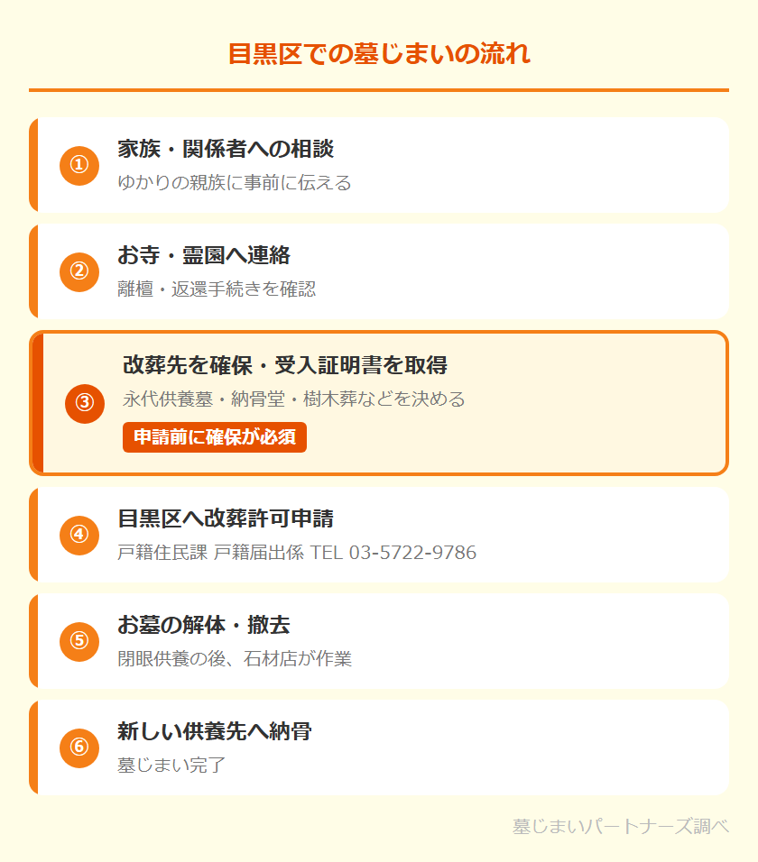 改葬先を先に決めておくことが重要です。目黒区への改葬許可申請には、新しい供養先が発行する「受入証明書または使用許可書」が必要になります。供養先が決まっていない状態では申請を進めることができませんので、この順番を守ることが手続きをスムーズに進めるポイントです。