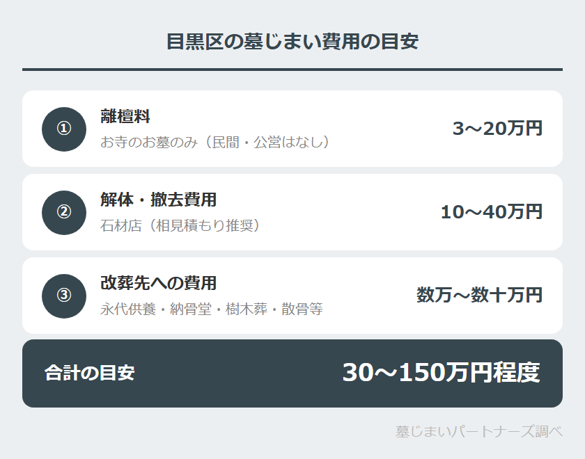 墓じまいにかかる費用は、大きく「①離檀料」「②石材店への解体・撤去費用」「③改葬先への費用」の3つに分かれます。それぞれの目安と、東京都内ならではの注意点を確認しておきましょう。
