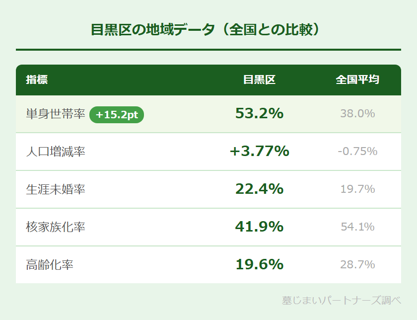 2020年の国勢調査によると、目黒区の単身世帯率は53.2%(全国平均38.0%)と高く、中目黒・自由が丘・学芸大学エリアなど住み心地の良い街として知られています。人口増減率は+3.77%(全国平均-0.75%)と増加基調にあり、高齢化率は19.6%と全国平均(28.7%)より低いため比較的若い世帯が多い区です。しかし、高所得者層が多く生活スタイルの変化が早い目黒区では、「老後のうちに自分でお墓のことを決めておきたい」という前向きな動機での墓じまい検討が増えています。
