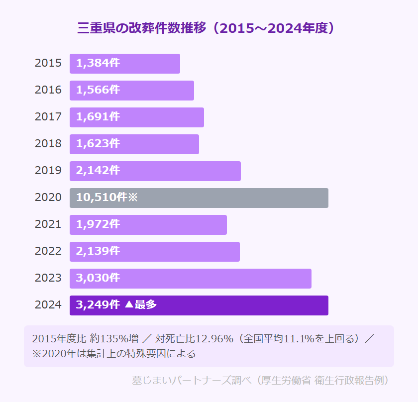 三重県の改葬件数は、2015年度の1,384件から2024年度の3,249件へと増加しました。2024年度が最多を記録しており、特に2023年度(3,030件)以降は増加のペースが加速しています。対死亡比12.96%(2024年度)は全国平均(11.1%)を上回っており、三重県では死亡者数に対して高い割合で改葬が行われています。なお、2020年度は10,510件という異例の数値を記録しましたが、これは一部自治体での旧墓地の集団整理・一括申請による特殊要因とみられ、通常の墓じまい件数の推移ではありません。