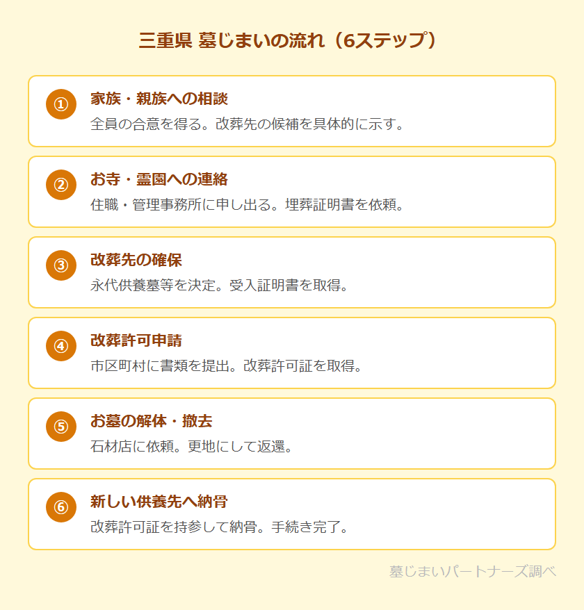 墓じまいは、家族・お寺・役所・石材店・改葬先の複数の関係者との調整が必要な手続きです。三重県での一般的な流れを6つのステップで確認しましょう。詳しい手続き全体については墓じまいの流れを8ステップで解説もご参照ください。