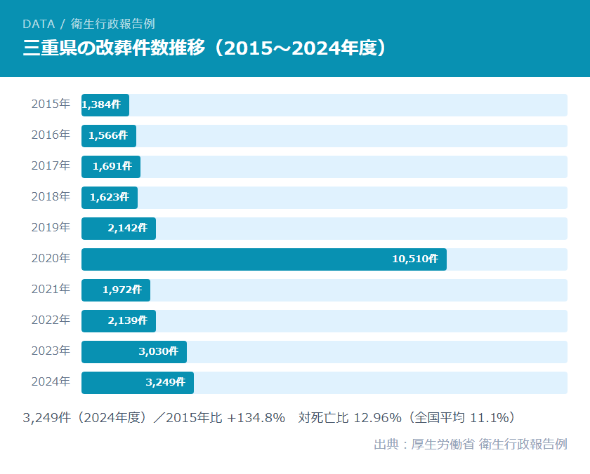三重県の2020年度の改葬件数は統計上10,510件と記録されていますが、これは一部自治体での旧墓地整理に伴う集団的な一括申請による特殊な要因とみられ、通常の個人による墓じまいの件数ではありません。2019年度(2,142件)や2021年度(1,972件)と比較しても、急激な変動は一括処理によるものと考えられます。2024年度の3,249件が直近の実態に近い数値です。