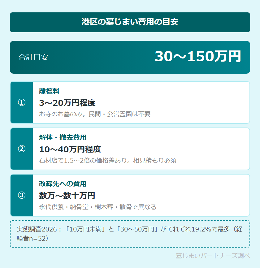 墓石を解体して区画を更地に戻す費用です。全国的な相場は10〜40万円程度ですが、東京都内では作業スペースが狭いケースも多く地方より高めになる傾向もあります。当サイトの調査(墓じまい実態調査2026(墓じまいパートナーズ)、2026年3月、経験者n=52)では「10万円未満」と「30〜50万円」がそれぞれ19.2%で最多でした。石材店によって1.5〜2倍程度の価格差が生じることがあるため、必ず複数の石材店に相見積もりを取ることをおすすめします。
