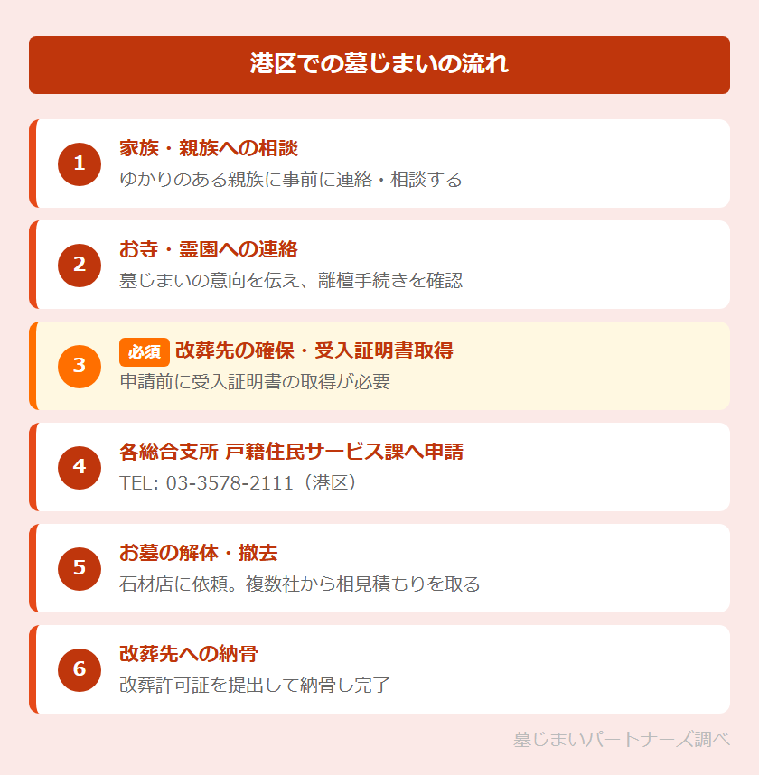 改葬先を先に決めておくことが重要です。港区への改葬許可申請には、新しい供養先が発行する「受入証明書または使用許可書」が必要になります。供養先が決まっていない状態では申請を進めることができませんので、この順番を守ることが手続きをスムーズに進めるポイントです。