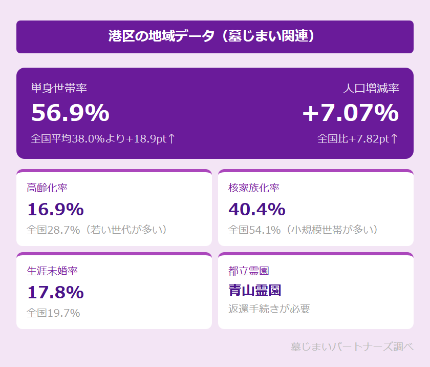2020年の国勢調査によると、港区の単身世帯率は56.9%(全国平均38.0%)です。全国平均を18.9ポイントも上回るこの数字は、港区が首都圏でも特に単身者・夫婦のみ世帯の多いエリアであることを示しています。外資系企業勤務者・外国人世帯・高所得者層など、多様なバックグラウンドを持つ転入者が多く、「実家のお墓があるが管理できていない」という方が増えています。