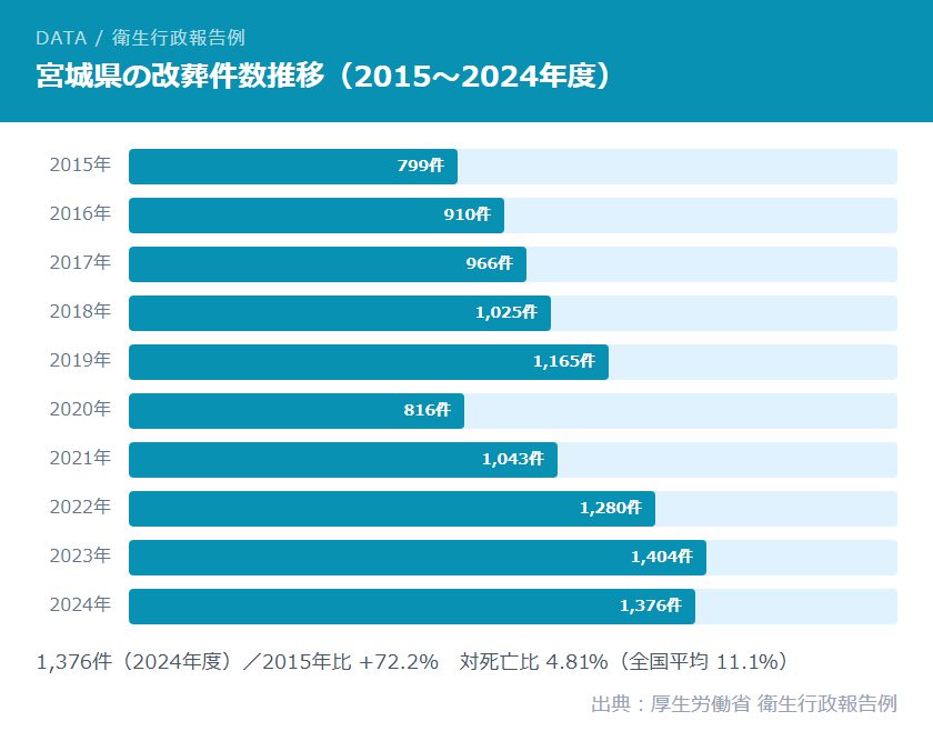 宮城県内の改葬件数(厚生労働省衛生行政報告例)は、2015年度の799件から2024年度には1,376件へと、この10年間で72.2%増加しました。2020年はコロナ禍の影響で816件に一時的に落ち込みましたが、その後は増加基調が続き、2022年以降は毎年1,000件を大きく超えています。