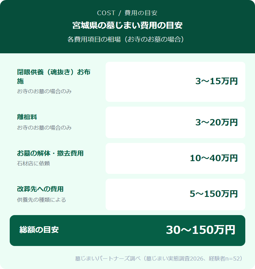 宮城県での墓じまいの総費用は、30〜150万円が目安です。内訳としては、閉眼供養のお布施(3〜15万円程度)、離檀料(3〜20万円・お寺のお墓の場合のみ)、石材店への解体・撤去費用(10〜40万円)、改葬先への費用(5〜150万円・供養先の種類による)があります。費用は石材店や改葬先の選択によって大きく変わるため、複数の選択肢を比較検討することをおすすめします。