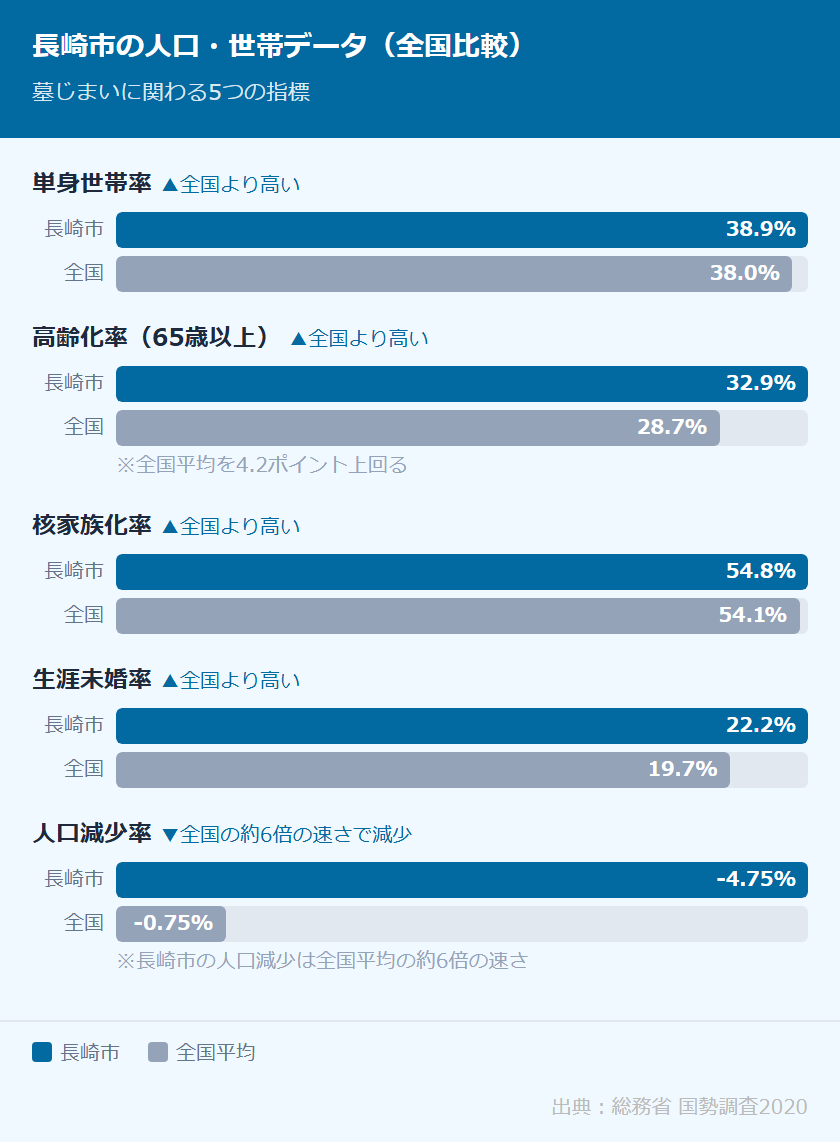 長崎市の人口・世帯データを全国平均と比較すると、墓じまいが増えている背景がはっきりと見えてきます。