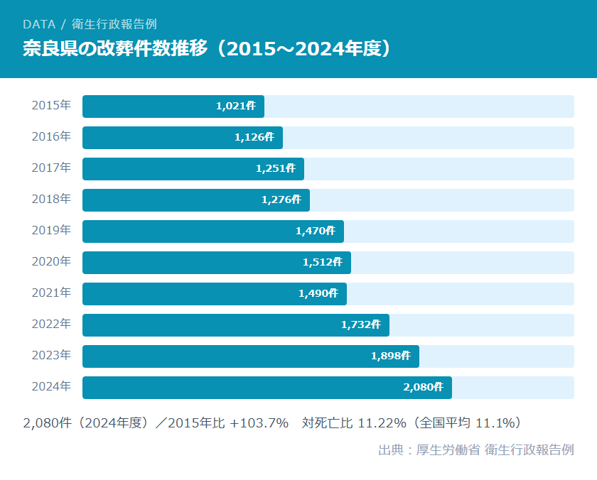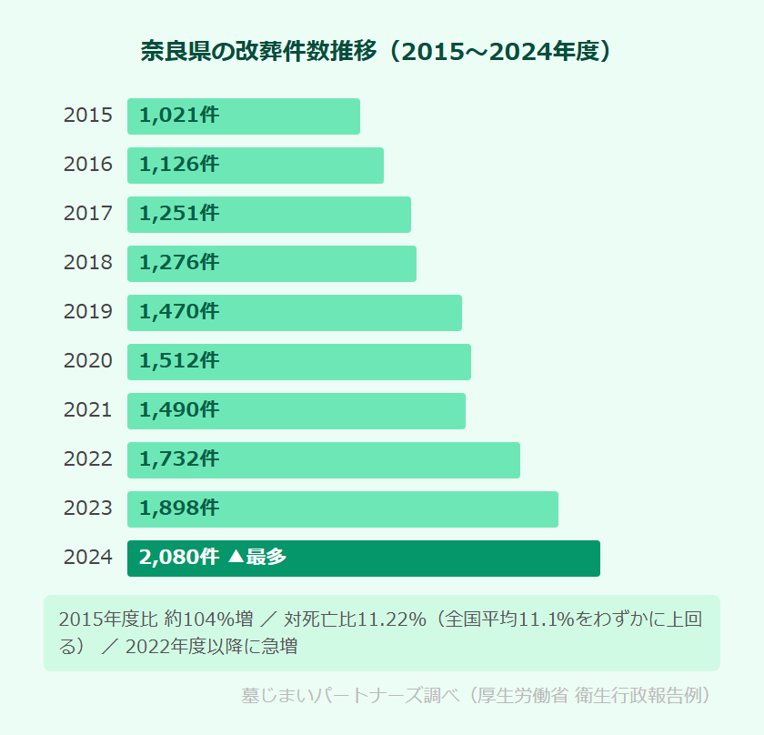 奈良県の改葬件数は、2015年度の1,021件から2024年度の2,080件へと、この10年で約2倍に増加しました。対死亡比11.22%は全国平均(11.1%)をわずかに上回っており、奈良県での墓じまいは着実に増加傾向にあります。2019年度に初めて1,400件台に達し、2022年度から再び急増が続いています。