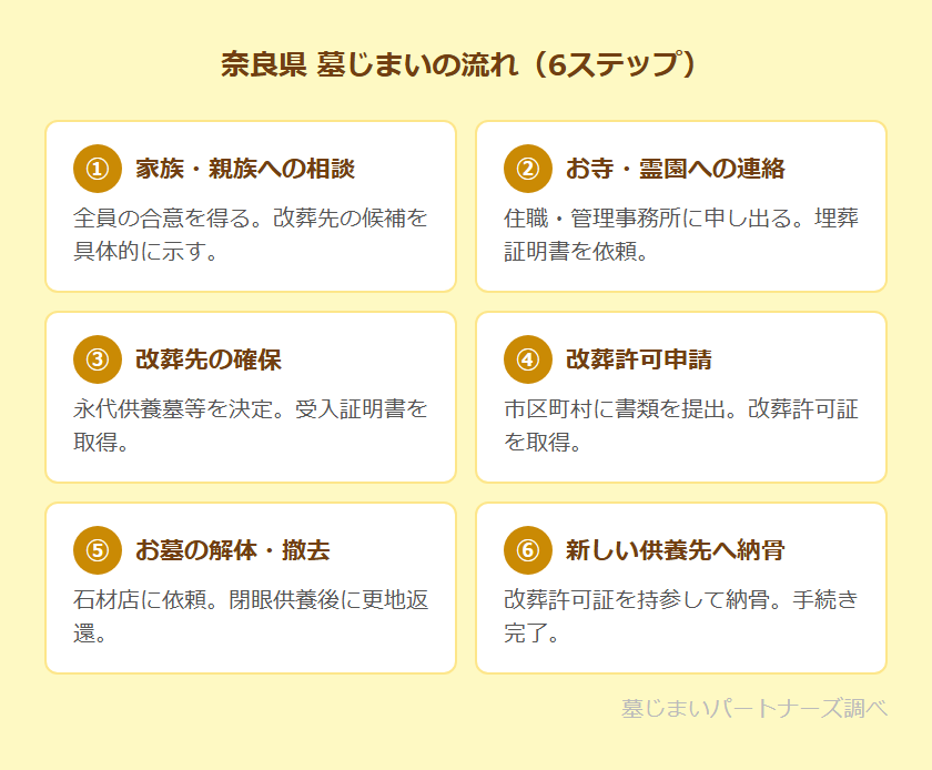 墓じまいは、家族・お寺・役所・石材店・改葬先の複数の関係者との調整が必要な手続きです。全体の流れを把握してから進めることで、スムーズに手続きが進みます。奈良県では寺院数が多く、宗派ごとに離檀の慣習が異なる場合があるため、事前にお寺に相談しておくことが特に重要です。奈良県での一般的な流れを6つのステップで確認しましょう。詳しい手続き全体については墓じまいの流れを8ステップで解説もご参照ください。
