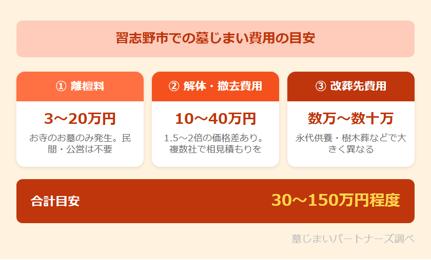 墓じまいにかかる費用は、大きく「①離檀料」「②石材店への解体・撤去費用」「③改葬先への費用」の3つに分かれます。それぞれの目安を確認しておきましょう。