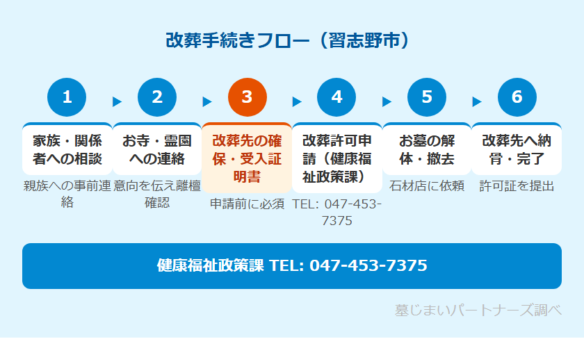 - 改葬許可申請の窓口は健康福祉政策課(TEL 047-453-7375)。改葬先を先に確保してから申請に進みましょう。