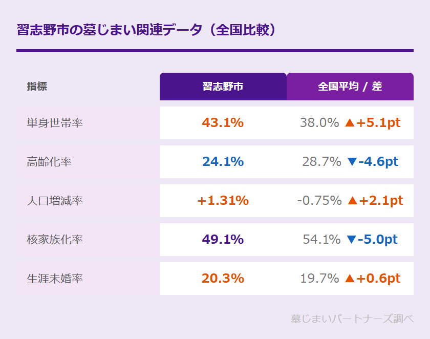 2020年の国勢調査によると、習志野市の単身世帯率は43.1%で全国平均(38.0%)を5.1ポイント上回っています。大学や自衛隊駐屯地が立地する習志野市は若い単身者が多い街で、「将来的にお墓を受け継ぐ人がいない」「実家のお墓を遠方から管理するのが難しい」という声が増えています。