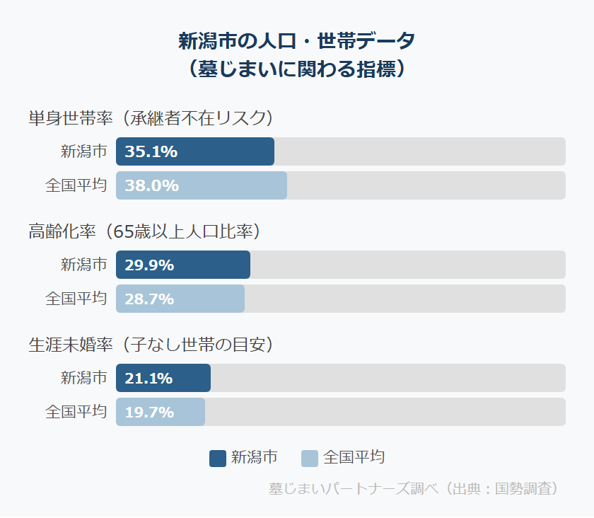 新潟市の高齢化率は29.9%で、人口は近年−2.58%と比較的大きな減少傾向にあります。単身世帯率は35.1%、生涯未婚率は21.1%と、「お墓を将来引き継ぐ人がいない」という問題が現実のものになっている地域です。