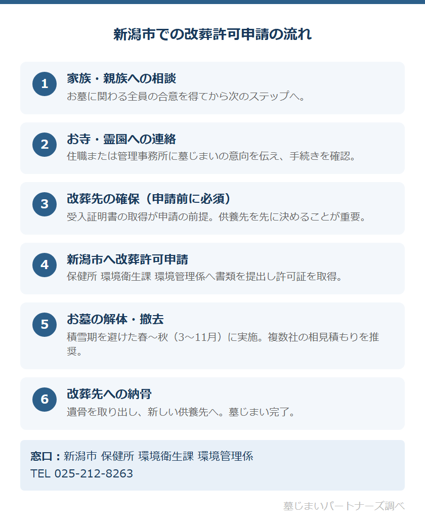 改葬先を先に決めることが重要です。新潟市への改葬許可申請には、新しい供養先が発行する「受入証明書または使用許可書」が必要になります。供養先が決まっていない状態では申請を進めることができません。
