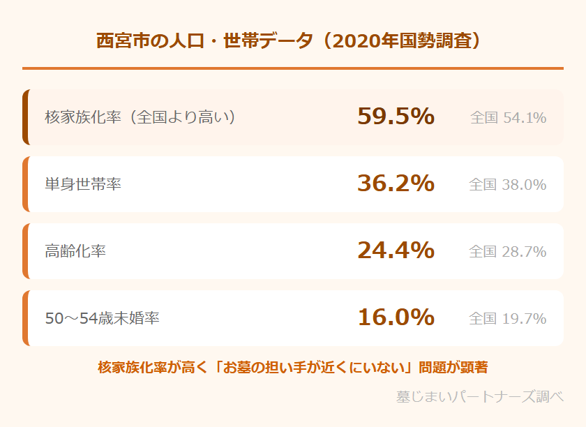 2020年の国勢調査によると、西宮市の核家族化率は59.5%(全国平均54.1%)と全国を5ポイント以上上回っています。多世代で同居する家庭が少なく、「お墓を引き継ぐ次の世代がいない」「遠方に住む子どもに負担をかけたくない」という悩みが、墓じまいを検討するきっかけになっているケースが多く見られます。
